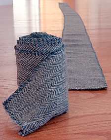 The wraps consistent of two long, narrow strips of cloth, typically wool, which were wound around the leg and foot. By starting at the knee and wrapping downwards and ending at the toes, no clips or fasteners are needed. The wraps stay firmly in place, even during vigorous activity. During the Viking age, the fabric would have been woven to the correct dimensions for the intended purpose, rather than cut from larger piece of cloth, as was done for the replica shown to the right. As a result, a leg wrap from the Viking age would have selvages along each edge which resisted fraying, rather than a stitch used on the modern replica. |
