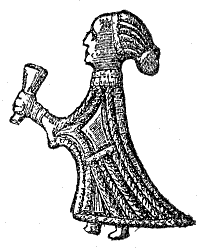 Head coverings were typically worn by women, perhaps as simple as a knotted kerchief over the head (left), which was suggested by finds at the Oseberg ship burial. Rígsţula (verse 2) says that even women of the lowest class wore a headdress. A number of different kinds of head-coverings for women are mentioned in the sagas, some of which are elaborate headdresses, which may have been worn like jewelry on special occasions. Laxdćla saga (chapter 45) tells of a headdress given by Kjartan to his bride Hrefna as a wedding gift. It had eight ounces of gold woven into the fabric. It has been suggested that the type of headdress worn served to distinguish married from unmarried women. |