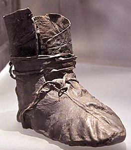 In some regions, leather survives well, and complete examples of a number of different shoe styles have been found. The illustration to the right shows various shoe styles found at the Viking-age trading town of Hedeby. The shoe shown to the left was found in the Oseberg ship burial. |