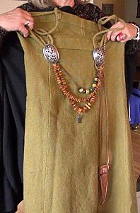 The photo to the left shows the individual pieces of fabric being fitted together to make the tunic. The photo to the right shows a finished tunic. The complexity results in a garment that doesn't bind or restrict movement. The upper part of the garment is relatively tight-fitting, but the sleeves are fitted to provide freedom of motion. The skirt ranged from thigh length to knee length. As with most articles of clothing, the length was determined by the wealth of the owner. A poorer man would not waste material that wasn't needed, while a more wealthy man would show off his wealth by using more material than was needed. On hot days, the skirt was lifted up and tucked into the belt for better cooling. Sleeves were probably longer than is typical in modern garments, reaching well past the wrists. |
