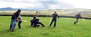 More recently, knattleikr was played at Víkingadagur (Viking Day) held by Minjasafn Austurlands in east Iceland. We started a game of knattleikr for adults, using the rules outlined on this page (left, explaining the rules). The game was very well received by the adults, who played vigorously. |