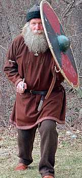 A leather sling, used to carry the shield over the shoulder (right), would have been common. There are many instances in the stories in which a fighter threw his shield over his back in order to wield his weapon with two hands, such as in chapter 53 of Egils saga. During a battle against Earl Hringr, Ţórólfr threw his shield over his back and thrust with his spear using both hands, eventually thrusting it through the earl's chest and out his back. Shields were slung over the shoulder when not in combat, as well. In chapter 14 of Gull-Ţóris saga, Ţórir went out to trim the manes of his horses. He worked with his shield hanging by his side. Bljúgr attacked unexpectedly, thrusting at Ţórir with his spear. The spear glanced off the shield and entered the horse's belly, killing the animal. The sling could sometimes be a dangerous nuisance. Bjarnar saga Hítdćlakappa (chapter 18) says that Eyvindr attacked Björn with his axe. The attack hit Björn's helmet and glanced off, but the back of the axe caught Björn's shield strap, redirecting the blow into his chest. Björn received minor wounds in his chest and leg from the attack. Björn threw his shield away, and struck at Eyvindr, causing his death. |