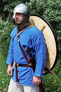 We tried this to test whether it was possible to swim with a shield on one's back, and whether the shield provided any protection. Swimming with a shiled while wearing Viking clothing was no problem. The shield seemed to provide some significant protection to the swimmer from arrows fired from the land, although the archers commented that the shield made the swimmer a better target. |