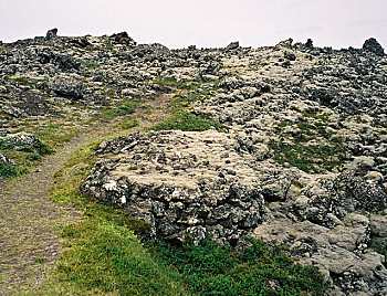In the sagas, berserks sometimes appear as stock characters. They are suitable villains for the saga hero to vanquish. Chapter 25 of Eyrbyggja saga tells the story of Halli and Leiknir, two berserks who were given to Styr. At first, Styr was able to put them to good use against his enemies, but later, the berserks became troublesome. In chapter 28, Halli asked for the hand of Styr's daughter in marriage, which would have been a disgrace for Styr's family. Styr went to Snorri goði for advice, who devised a plan. Styr told the berserks that they must prove themselves worthy of the marriage by building a road through an impassible lava field. When they finished the arduous task, Styr invited the berserks to take a hot bath and to rest. Styr locked them in the bath-house, and then made the house unbearably hot. As the berserks broke down the door and burst out, Styr killed them with a spear. He buried them in a deep hole alongside the path through the lava. The grave mound is still visible along the path (left), and when it was investigated, the mound was found to contain the bones of two very large men. |