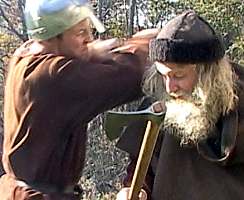 A speculative reconstruction of the fighting moves of a man who attacks strongly, but who becomes timid when he realizes his opponent is strong, is shown in this Viking combat demonstration video, part of a longer fight.