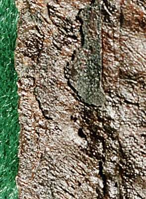 Scabbards, being organic, rot away, but they leave their traces on the surviving blades in ways that inform us about the scabbard construction. These close-up photos of an early 9th century Viking sword blade show the remnants of the scabbard on the blade. The photo to the left shows the full width of the blade immediately adjacent to the crossguard. The wood grain of the scabbards wooden core is clearly visible. To the right is an extreme close up of the edge of the same blade, near the point. The traces of the fibers of the fleece that formed the innermost layer of the scabbard are visible on the blade. |