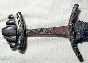 For example, the Petersen Type B hilt shown to the left indicates that the sword was probably made between the middle of the 8th century and the early part of the 9th century. Not only did the size and shape of the hilt components vary in Viking-age swords, but also the construction details. Sword hilts typically had a pommel and an upper guard, although in some instances, the two were formed as a single piece. |