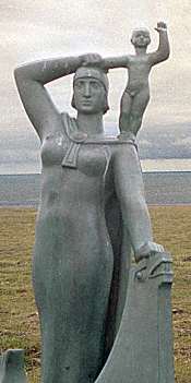 For the rite, Þorbjörg asked for the assistance of women who knew the witchcraft poems, but none were available at the settlement. Inquiries were made far and wide. Finally Guðríður (right, with her son Snorri), who was visiting from Iceland, admitted that she had been taught the poems. But she added, "This is the sort of knowledge and ceremony that I want nothing to do with, for I am a Christian." Þorkell prevailed upon Guðríður to assist, and she consented. The women formed a circle around the ritual platform upon which Þorbjörg sat, and Guðríður recited the poems. Þorbjörg said that there were many spirits present that had been charmed by the chanting, and that many things had been revealed. She predicted that the famine would end soon, and that Guðríður would return to Iceland to start a great and eminent family. Both predictions came to pass. |