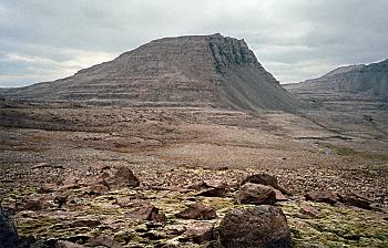 When Önundur tré-fótr (wooden-leg) arrived, he was told that little unsettled land was still left. He bought land under Kaldbakur (cold-back mountain, right), dismayed by all he gave up in Norway only to gain a cold-backed mountain. |