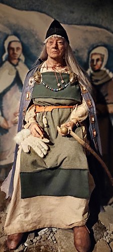 In the district there lived a woman named Thorbjorg, a seeress who was called "little prophetess", who spent the winter visiting one farm after another where she had been invited. When she arrived, she was wearing a black mantle with a strap, which was adorned with precious stones right down to the hem. About her neck she wore a string of glass beads and on her head a hood of black lambskin lined with white catskin. She bore a staff with a knob at the top, adorned with brass set with stones on top. About her, she had a linked charm belt with a large purse. In it she kept the charms which she needed for her predictions. She wore calfskin boots lined with fur with long, sturdy laces and large pewter knobs on the ends. On her hands she wore gloves of catskin, white and lined with fur.