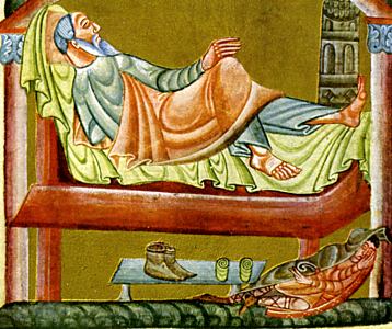 An illustration from a later medieval manuscript (from after the end of the Viking age) shows how this might have been done. It shows a man sleeping in bed, his head and upper body propped up against the wall. His shoes and leg-wraps are neatly placed under the bed. On the floor, a servant or slave sleeps, likewise, propped up against a pillar. A loft over the pantry at Eiríksstağir was used for food storage, and a loft over the entrance was used for sleeping. It is thought that slaves and children slept in the loft. |